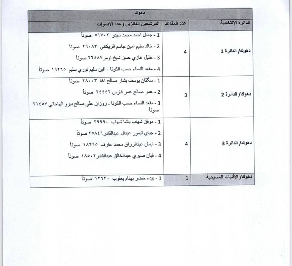 أسماء النواب الفائزين في الانتخابات النيابية عن محافظة دهوك