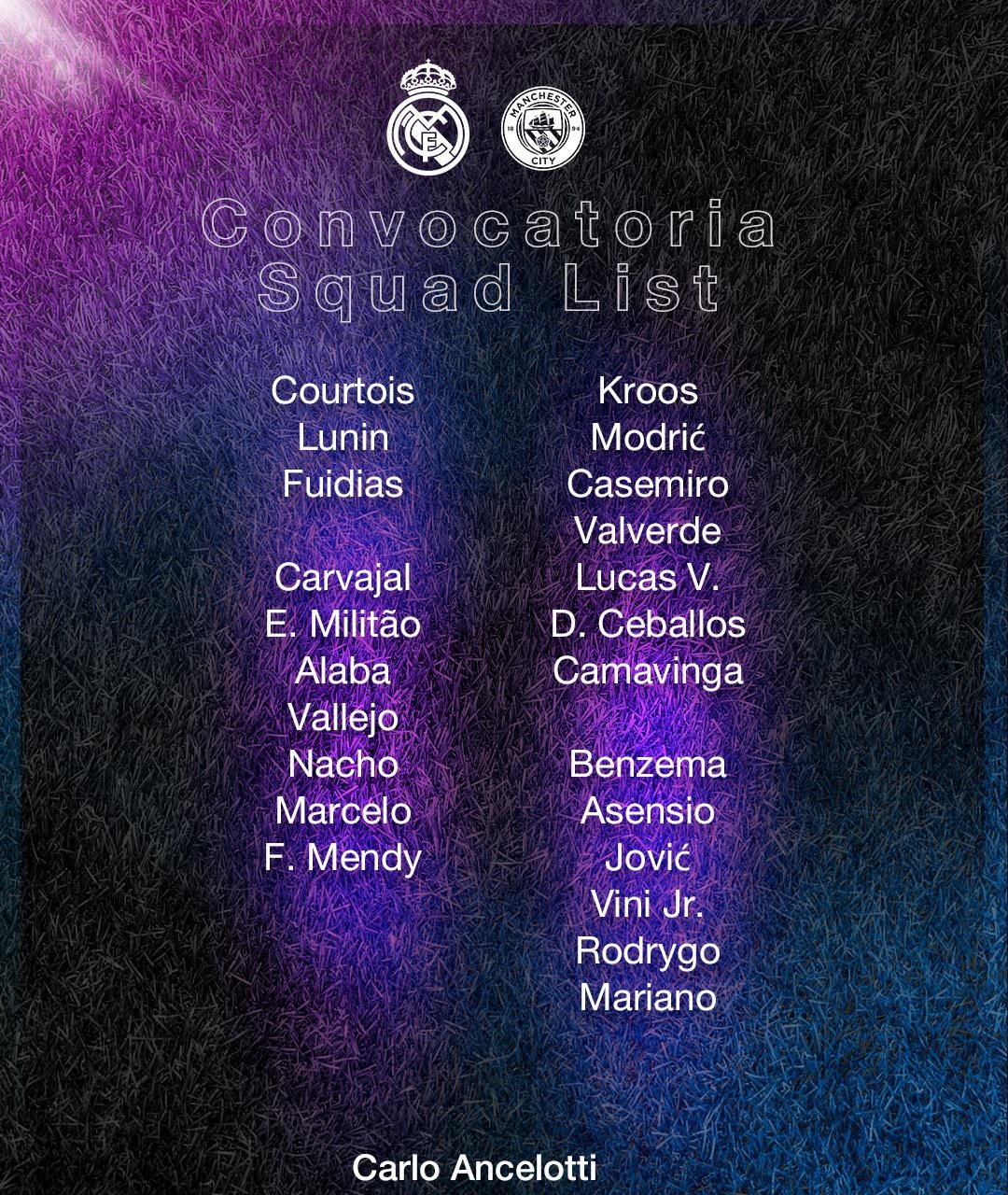 أعلن المدير الفني للفريق الأول لكرة القدم بنادي ريال مدريد، كارلو أنشيلوتي، عن قائمة اللاعبين الذين سيخوضون مباراة مانشستر سيتي في إياب نصف نهائي دوري أبطال أوروبا.