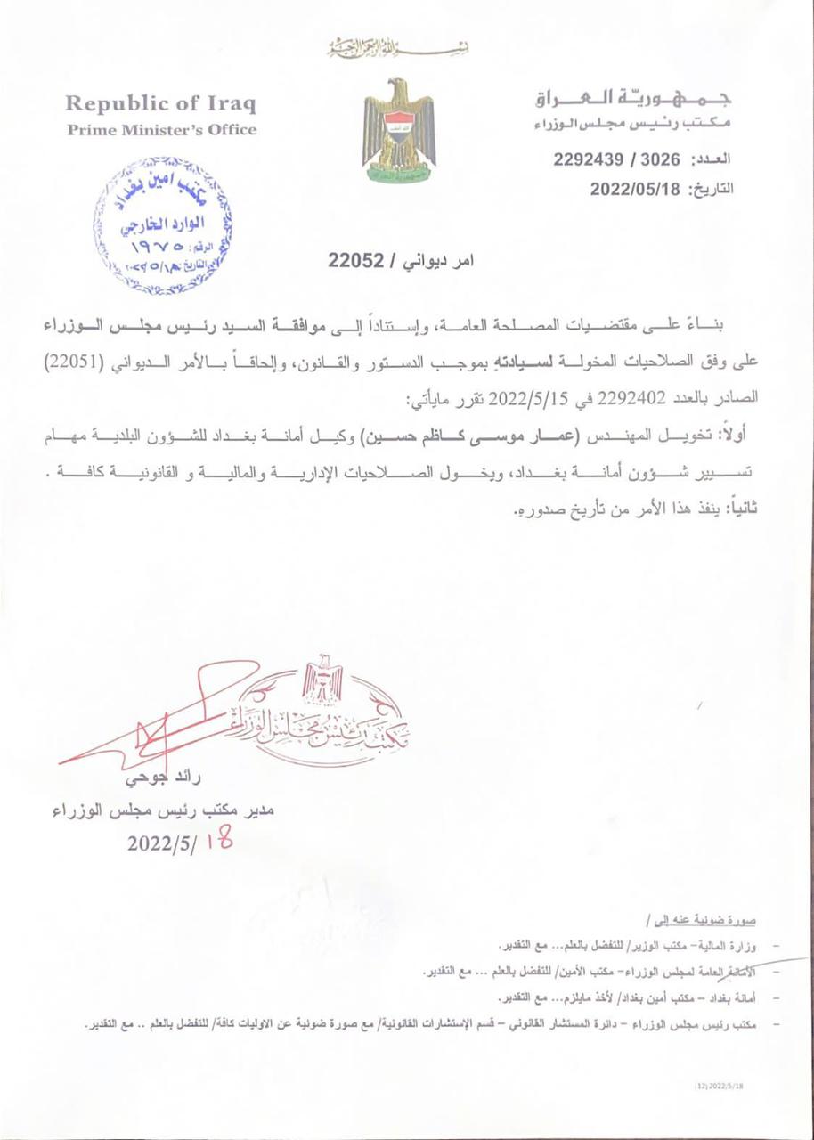 بالوثيقة.. تخويل (عمار موسى) بمهام تسيير شؤون أمانة بغداد