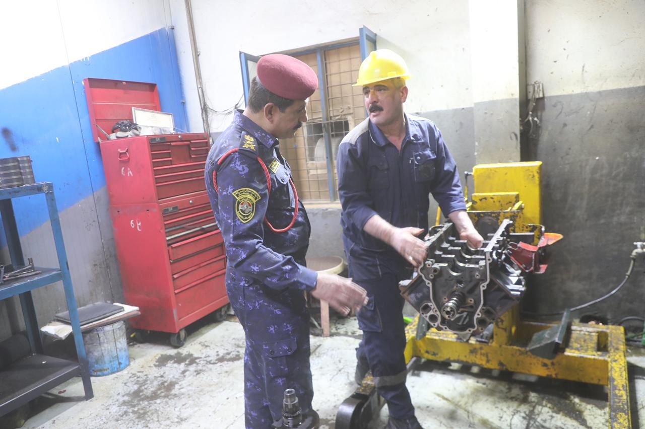 قائد قوات الشرطة الاتحادية يتفقد معمل تصليح القيادة في معسكر الجعارة ببغداد .