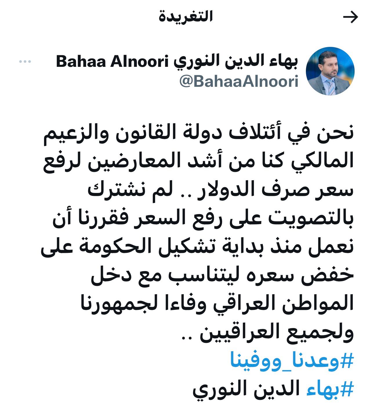 المتحدث بأسم ائتلاف دولة القانون بهاء الدين النوري: ائتلاف دولة القانون والزعيم المالكي كانوا من أشد المعارضين لرفع سعر صرف الدولار