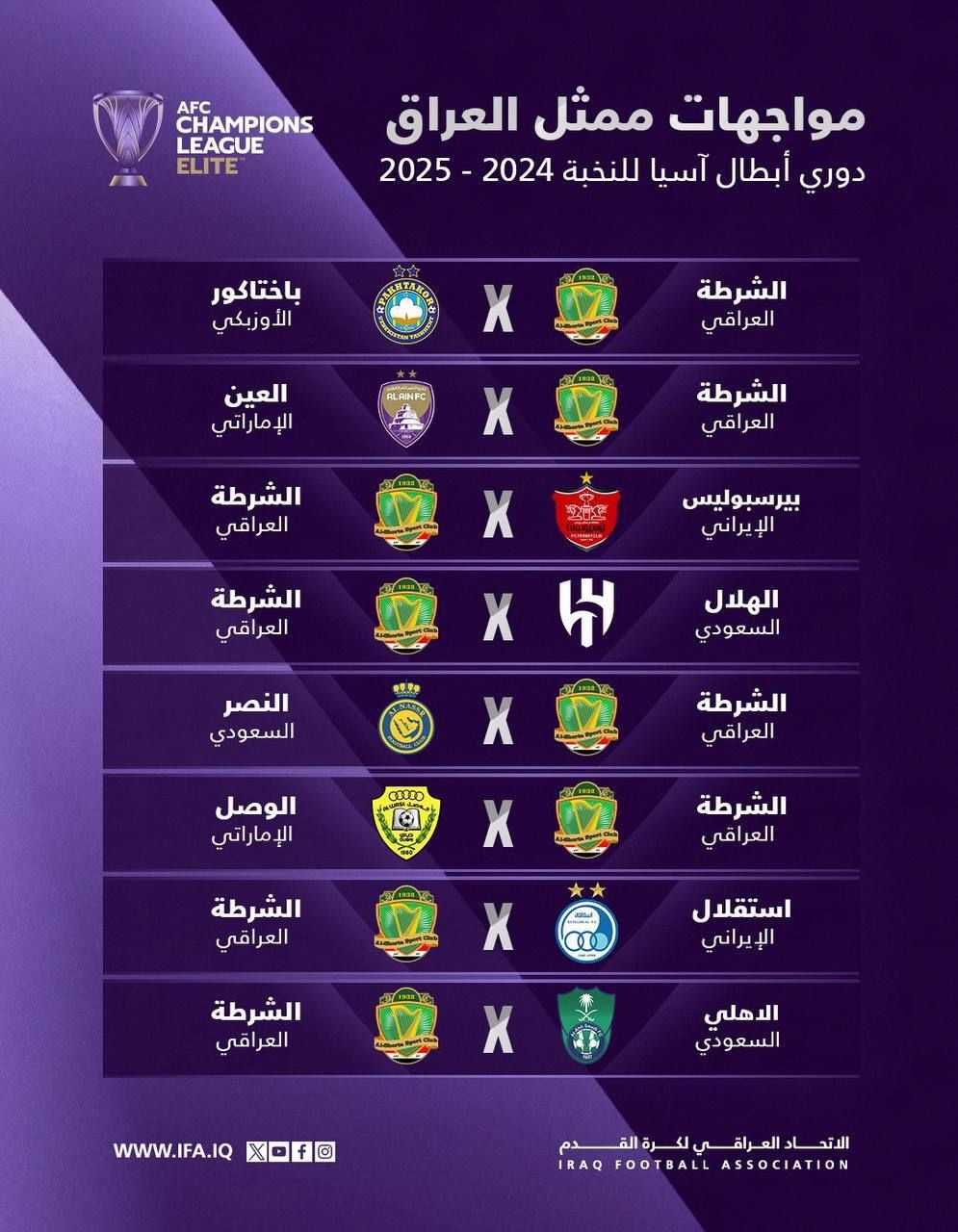 وذكر بيان مقتضب لاتحاد كرة القدم أن " القرعة أوقعت فريق الشرطة أمام فرق باختاكور الأوزبكي والعين الإماراتي وبيربوليس الإيراني والهلال السعودي والنصر السعودي والوصل الإماراتي واستقلال طهران الإيراني والأهلي السعودي