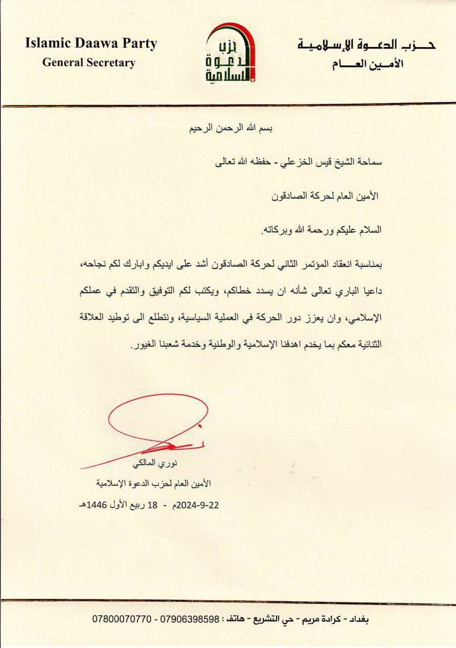 السيد نوري المالكي يبارك للشيخ قيس الخزعلي إنعقاد المؤتمر الثاني لحركة الصادقون ويتمنى لهم التوفيق والتقدم في عملهم