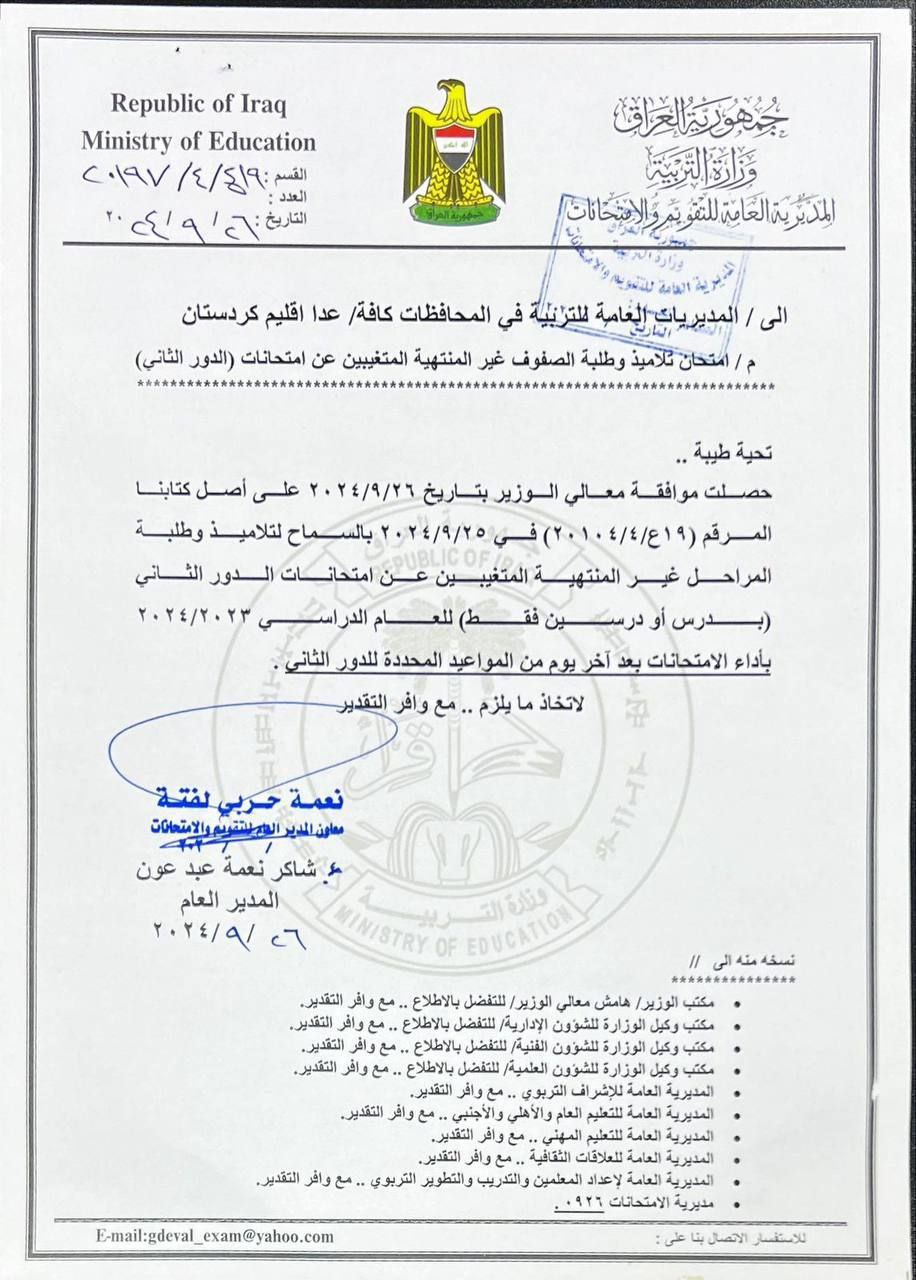 وذكرت الوزارة في بيان، انه "حصلت موافقة وزير التربية بالسماح لطلبة وتلاميذ المراحل غير المنتهية من المتغيبين في (درس واحد او درسين فقط) ضمن أيام امتحانات "الدور الثاني" للعام الدراسي (2023-2024) من اداءها في نهاية الامتحانات".