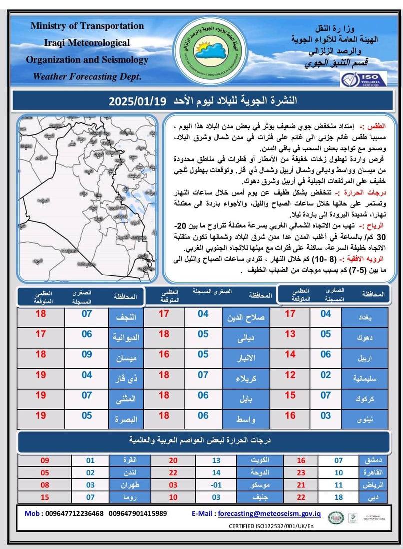 أصدرت هيئة الأنواء الجوية تقريراً مفصلاً عن توقعات الطقس لهذا اليوم الأحد والأيام المقبلة، مبينة حالة الأجواء في مختلف المدن العراقية.