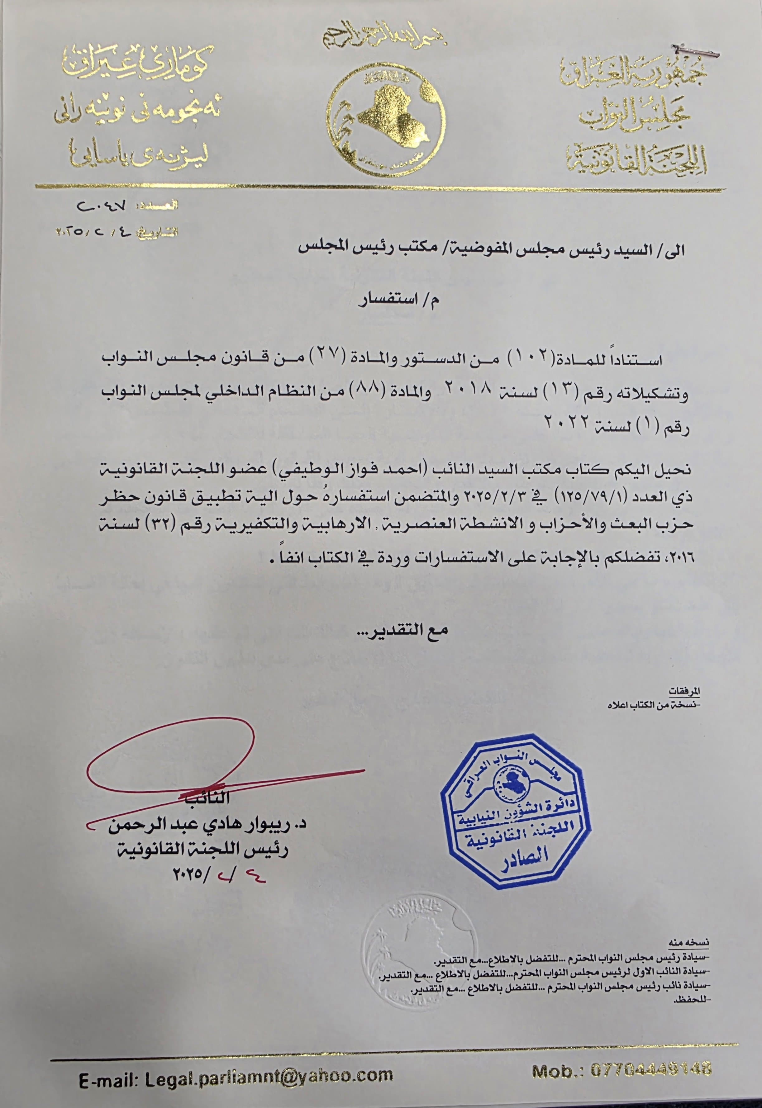 وبحسب كتاب رئيس اللجنة القانونية ريبوار هادي عبد الرحمن فقد جاء فيه أنه إستناداً إلى المادة الثانية بعد المئة من الدستور والمادة السابعة والعشرين من قانون مجلس النواب والمادة الثامنة والثمانين من النظام الداخلي لمجلس النواب فقد تم إحالة كتاب النائب أحمد فواز الوطيفي إلى رئيس مجلس المفوضين والمتضمن إستفساره بشأن آلية تطبيق حظر حزب البعث البائد والأحزاب والأنشطة العنصرية الإرهابية التكفيرية رقم اثنين وثلاثين لسنة الفين وستة عشر للإجابة على الإستفسارات الواردة في الكتاب.
