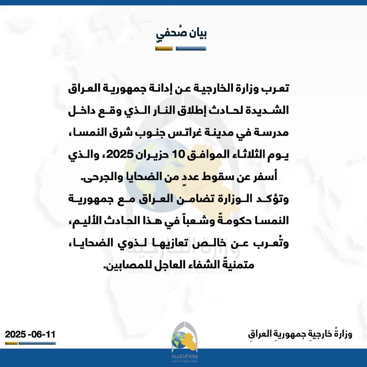 وذكرت الخارجية في بيان، أن "الوزارة تعرب عن إدانة جمهورية العراق الشديدة لحادث إطلاق النار الذي وقع داخل مدرسة في مدينة غراتس جنوب شرق النمسا يوم أمس، والذي أسفر عن سقوط عدد من الضحايا والجرحى".
