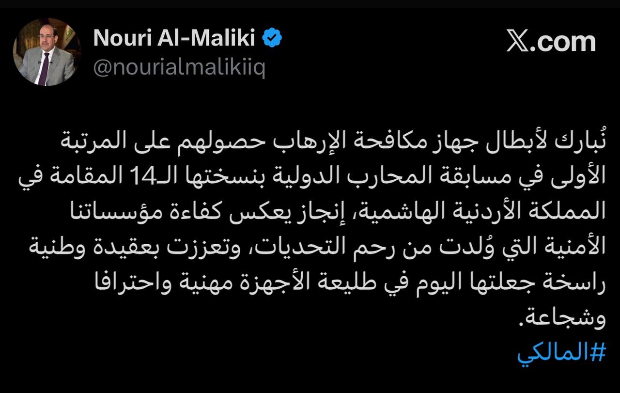 السـيـد نـوري الـمـالكي يبارك لأبطال جهاز مكافحة الإرهاب حصولهم على المرتبة الأولى في مسابقة المحارب الدولي