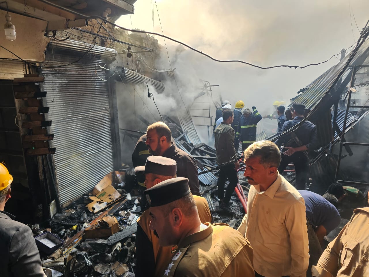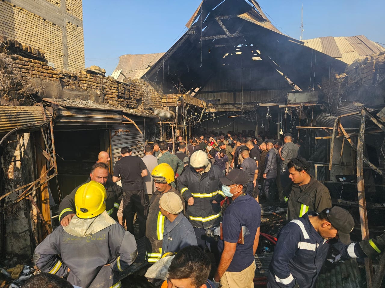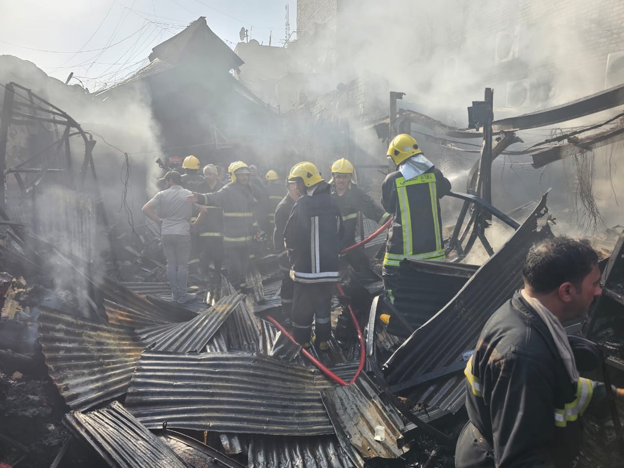 بالصور.. فرق الدفاع المدني تتمكن من اخماد حريق اندلع في عدد من المحال التجارية بقضاء الشطرة بمحافظة ذي قار دون وقوع ضحايا