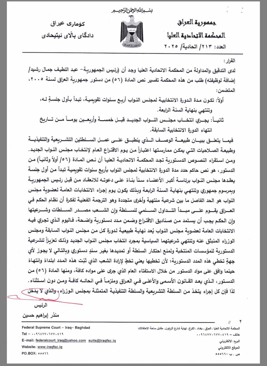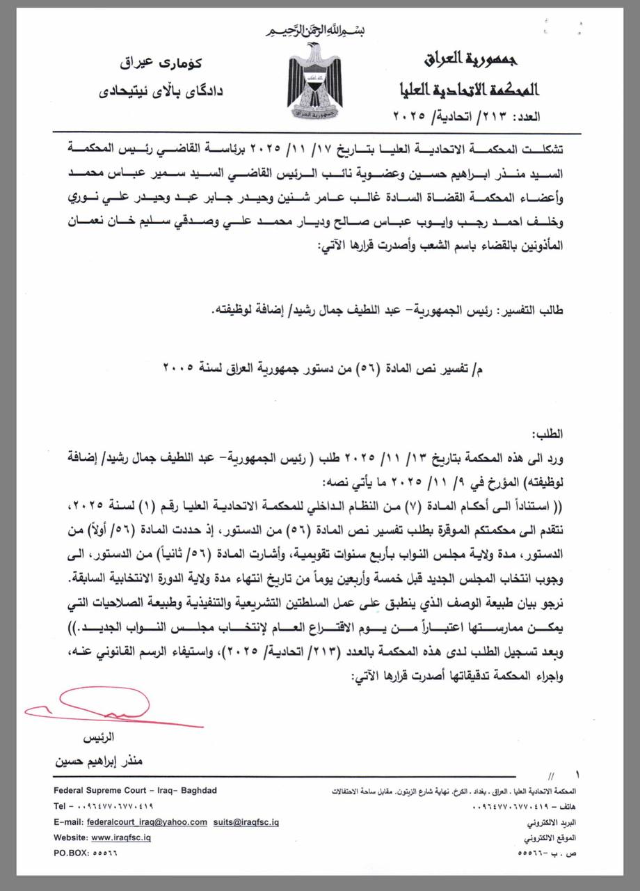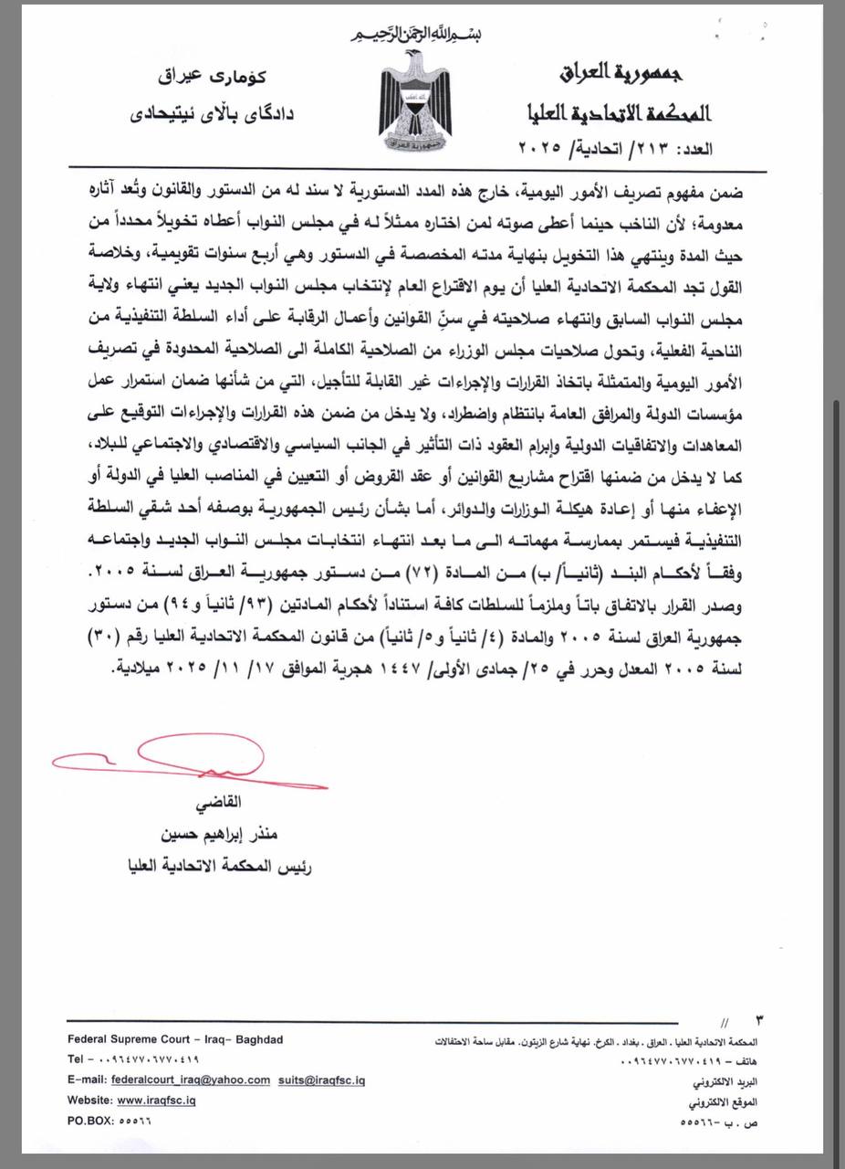 المحكمة الاتحادية العليا تؤكد انتهاء ولاية مجلس النواب وتحول صلاحيات مجلس الوزراء إلى تصريف أعمال واستمرار مهام رئيس الجمهورية