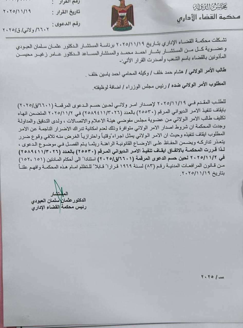 محكمة القضاء الإداري تصدر امراً ولائياً بإيقاف إنهاء تكليف هشام الركابي من عضوية مجلس امناء هيئة الإعلام والاتصالات