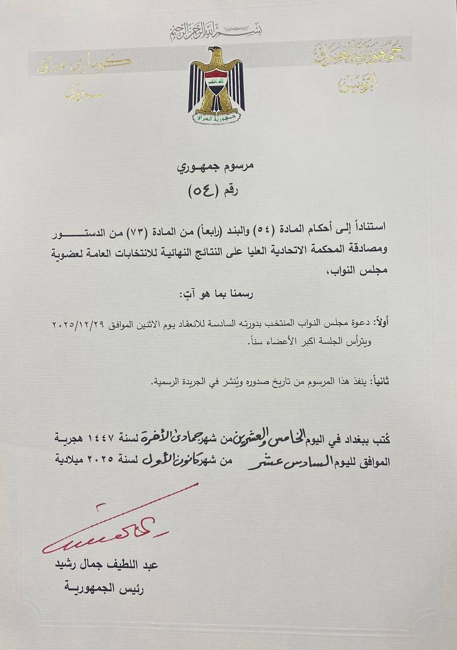 حدد رئيس الجمهورية عبد اللطيف جمال رشيد، اليوم الثلاثاء، تاريخ الـ 29 من كانون الاول الجاري موعداً لانعقاد الجلسة الاولى لمجلس النواب.