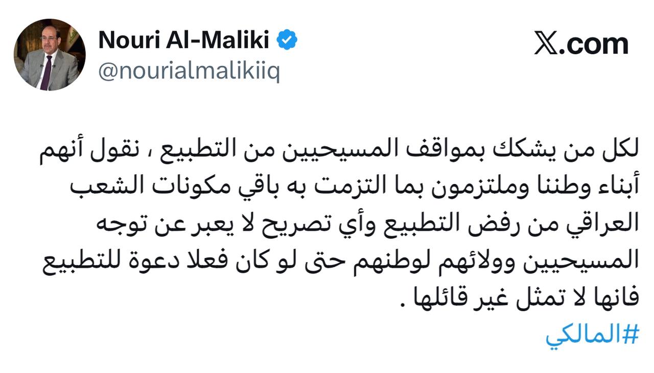 السيد المالكي : أي تصريح لا يعبر عن توجه المسيحيين وولائهم لوطنهم حتى لو كان فعلاً دعوة للتطبيع فأنها لا تمثل غير قائلها