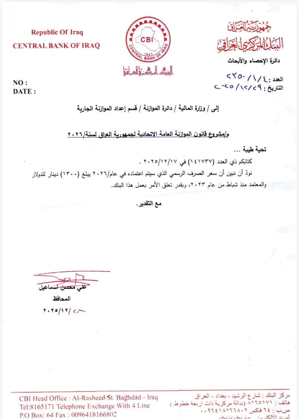البنك المركزي يخاطب المالية: سعر الصرف الرسمي سيكون 1300 دينار في موازنة 2026