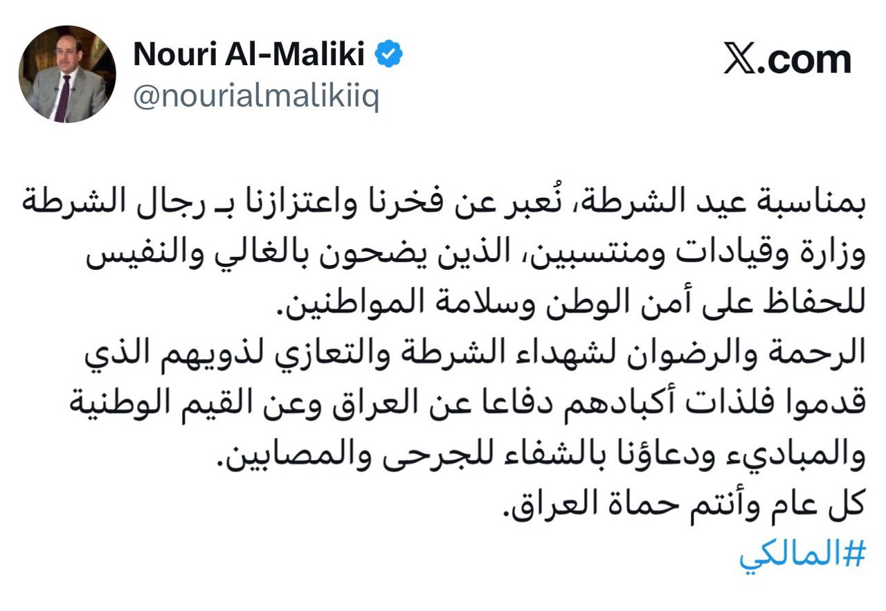السيد المالكي وفي تدوينة له على منصة (أكس ) عبر عن فخره وأعتزازه برجال الشرطة الذين ضحوا بالغالي والنفيس حفاظاً على أمن الوطن وسلامة المواطنين ، سائلاً المولى العلي القدير الرحمة والرضوان لشهداء الشرطة والتعازي لذويهم الذين قدموا فلذات أكبادهم دفاعاً عن العراق والقيم الوطنية والمبادئ ، داعياً بالشفاء للجرحى والمصابين.