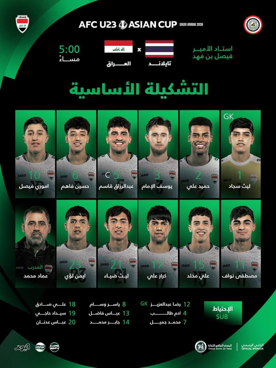 تشكيلة منتخبنا الاولمبي لمواجهة منتخب تايلاند ضمن منافسات بطولة كأس اسيا تحت (23) عاماً