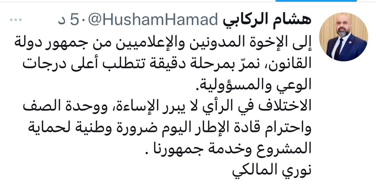 الركابي: إلى الإخوة المدونين والإعلاميين من جمهور دولة القانون نمر بمرحلة دقيقة تتطلب أعلى درجات الوعي والمسؤولية